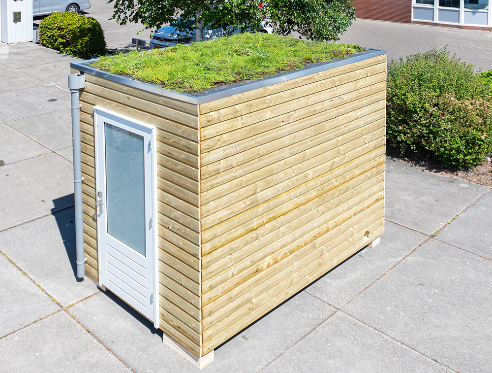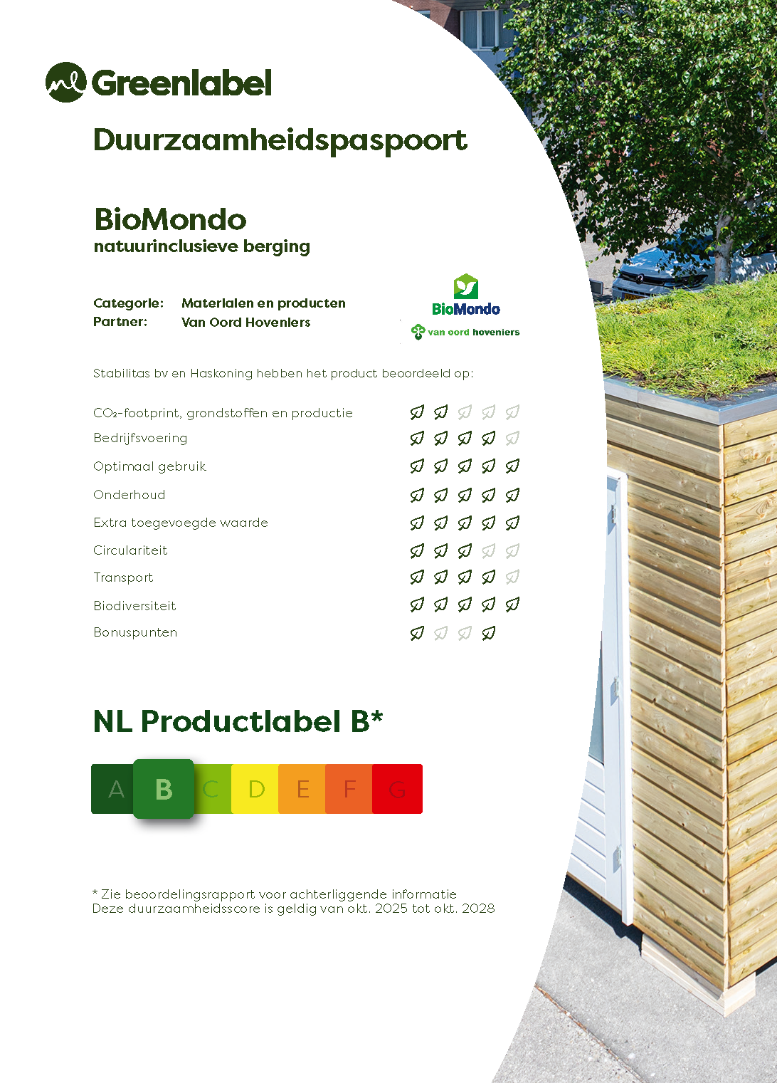 De BioMondo is dé natuurinclusieve berging waarin functionaliteit en biodiversiteit samenkomen. Ontworpen om de buitenruimte(s) in projecten, van woningbouw tot utiliteitsbouw en particuliere tuinen niet alleen groener, maar ook klimaatbestendiger en levendiger te maken. Met geïntegreerde nestkasten, een insectenhotel, egelhuis, groengevel en een weelderig vegetatiedak creëer je een veilige en aantrekkelijke leefomgeving voor vogels, vlinders, bijen, vleermuizen én egels.